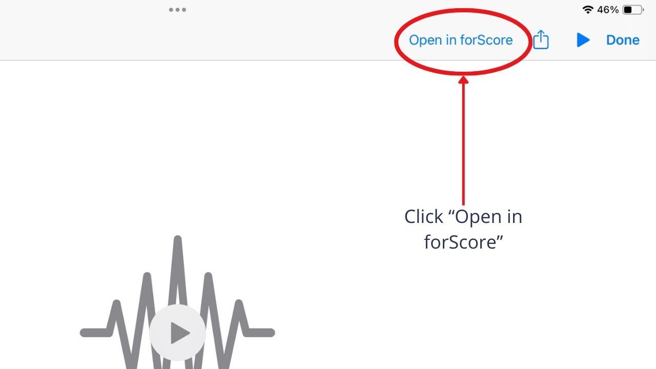From here, the file will open and there will be a message in the upper right-hand corner of the screen that says "Open in forScore". Click on that link. From here, forScore will open and it will appear that nothing has happened, but the track has been added to a list of audio files within the app.