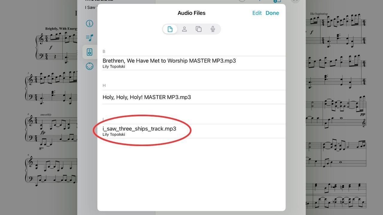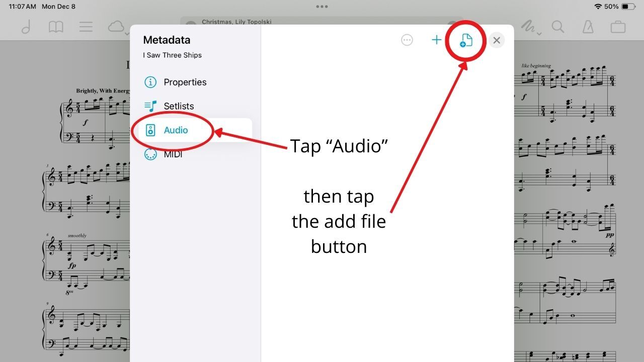 In the Metadata, click on "Audio" and then the add file button to access your imported tracks list. Here, you will click on the name of the background track you imported and it will be linked to your sheet music!